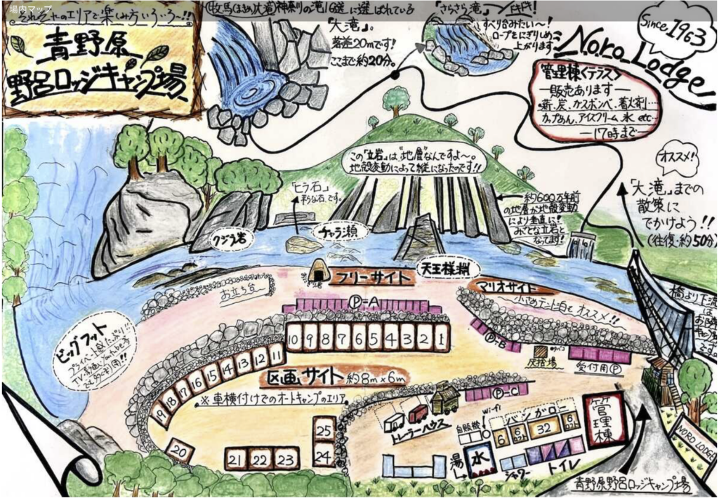 川沿いにデイキャンプサイト、川から少し上がったところに約8m×6mの区画オートサイトが1番〜25番まで、あとはトレーラーハウスやバンガローなんかもありましたね。