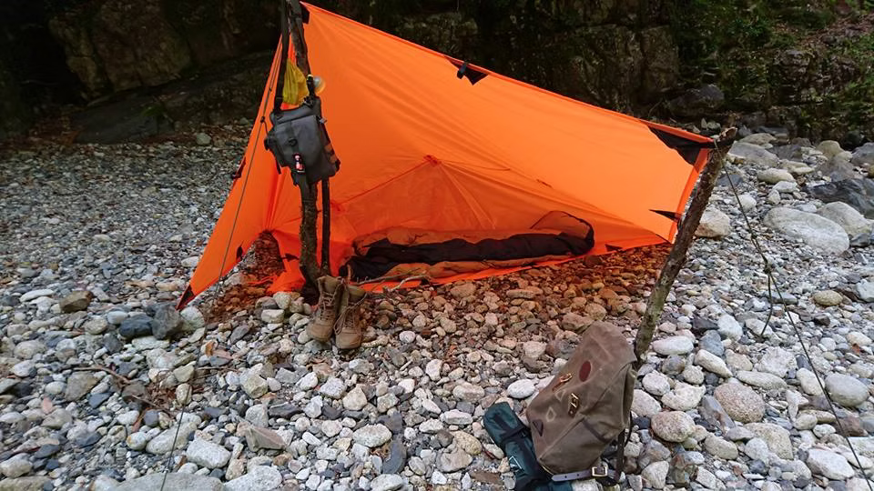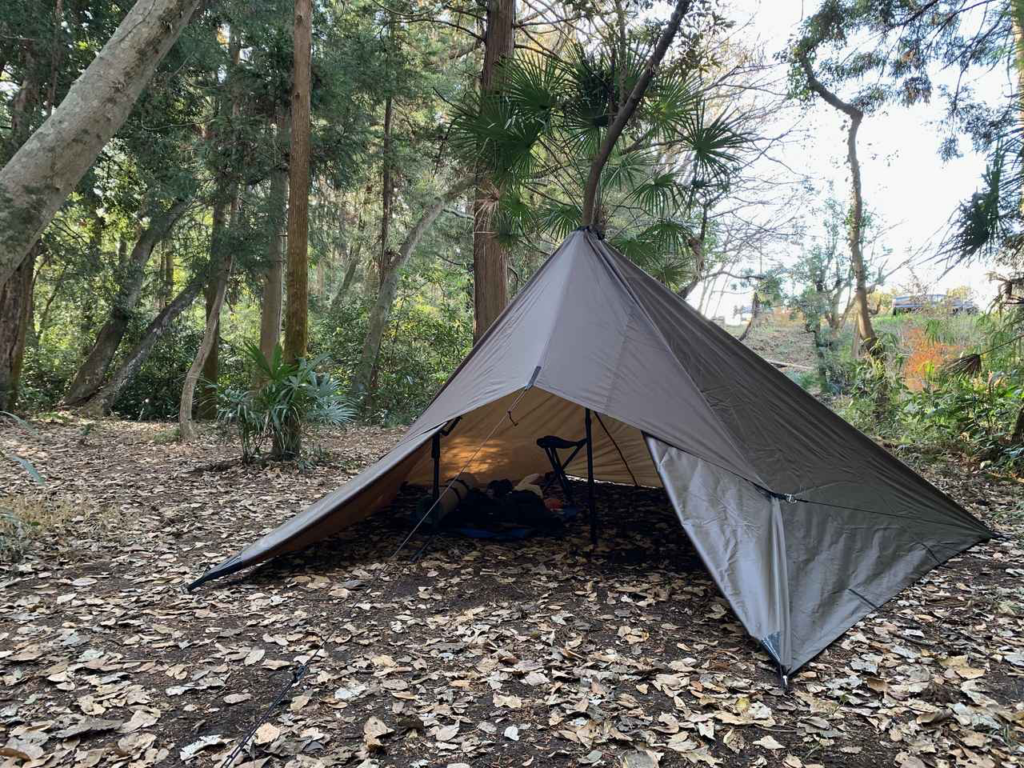 だいたいハンモックと一緒に使います。ちなみに正直言うとソロでテント使う時には張るのめんどいんであんまりタープ使いません。すみません。