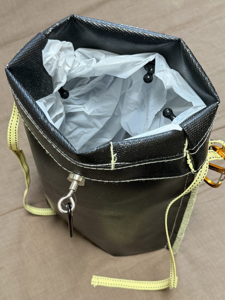 そして徒歩キャンプでゴミが持ち帰りのキャンプ場でも、ビニール袋をこのアッシュキャリーに入れたままバックパックにぶら下げて持って帰ればビニール袋そのままよりも精神・物理衛生上かなり良いです。