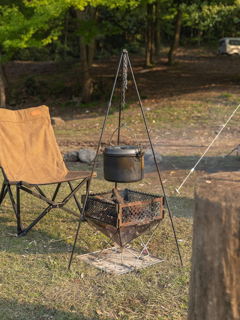 ひとつは「トライポッド」という三脚のようなギアを使って焚き火の上に調理器具を吊り下げる方法です。