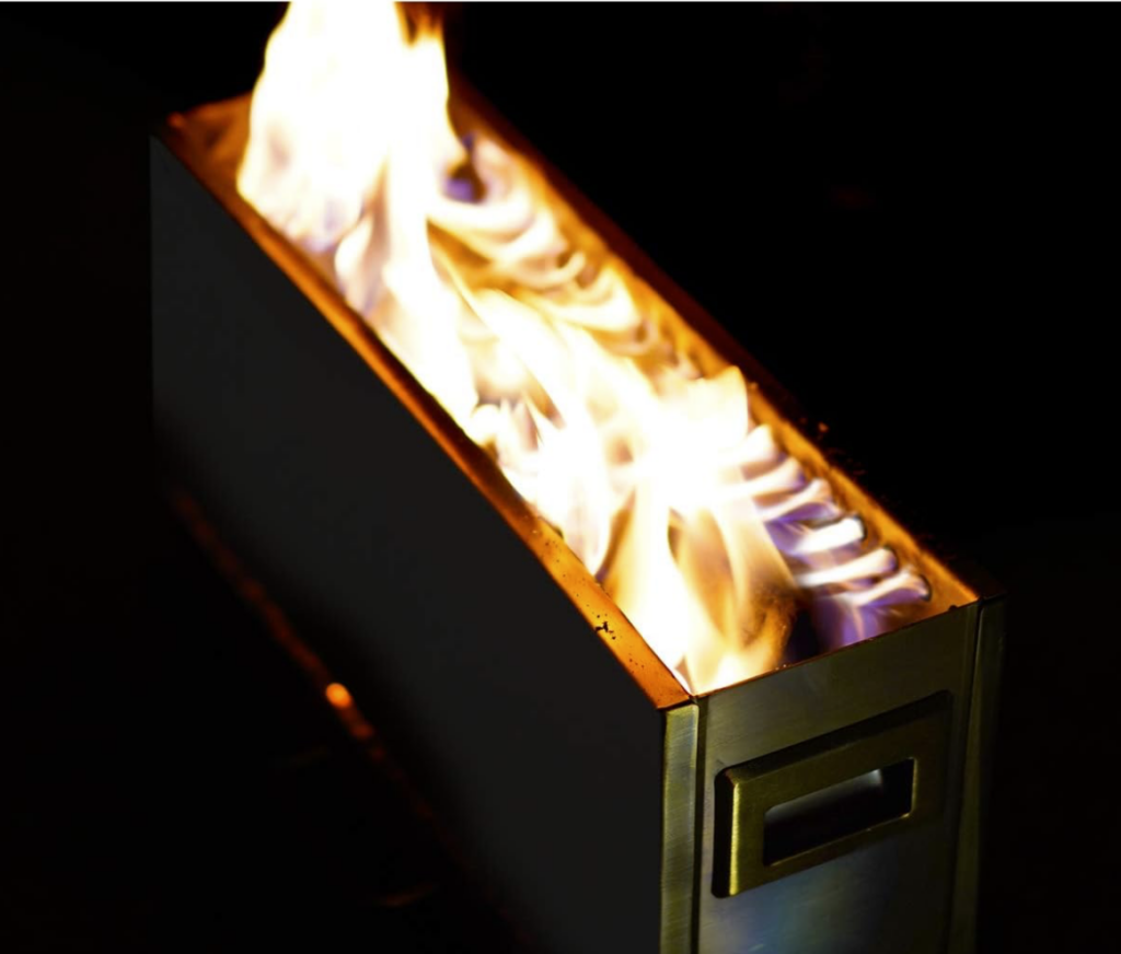 自然界の不規則な火とは対照的な、垂直に力強く伸びる「設計された機能美」を楽しめます。