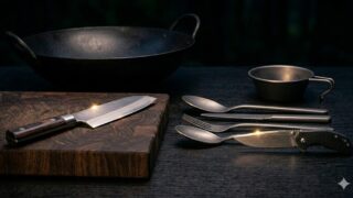スノーピークやオピネルなど、愛用のキャンプ用キッチンツールを全公開。包丁、まな板、シェラカップ、カトラリーなど、実体験に基づく本音レビュー。軽量化のヒントや「ロマン枠」な小物まで一気に紹介します。