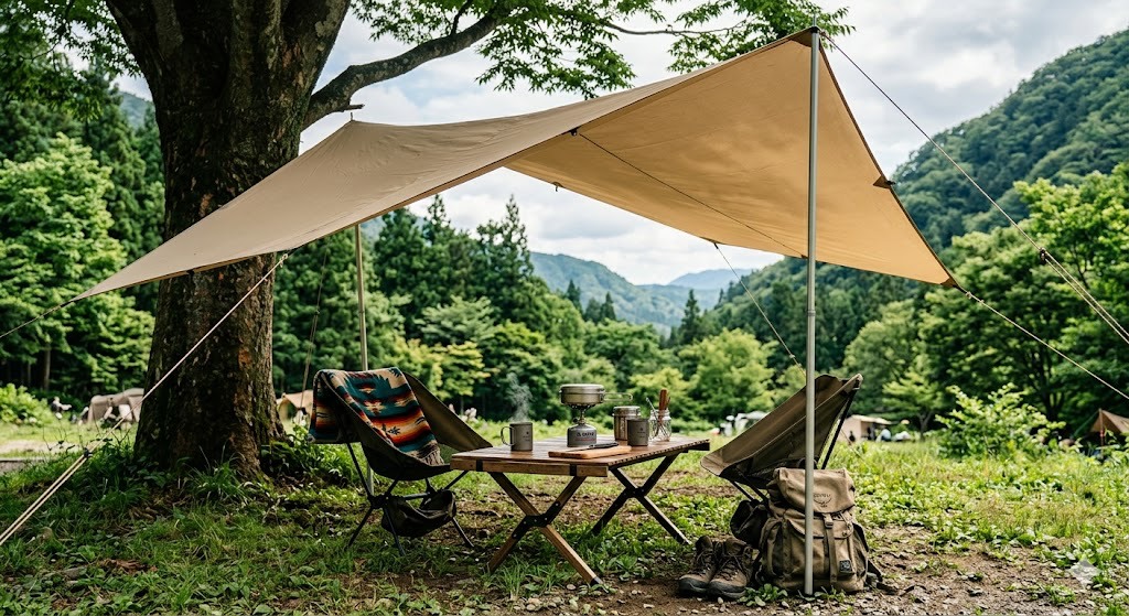 タープは、いわば「屋根だけのリビング」です。テントの外に日陰や雨避けを作るための大きな布ですね。