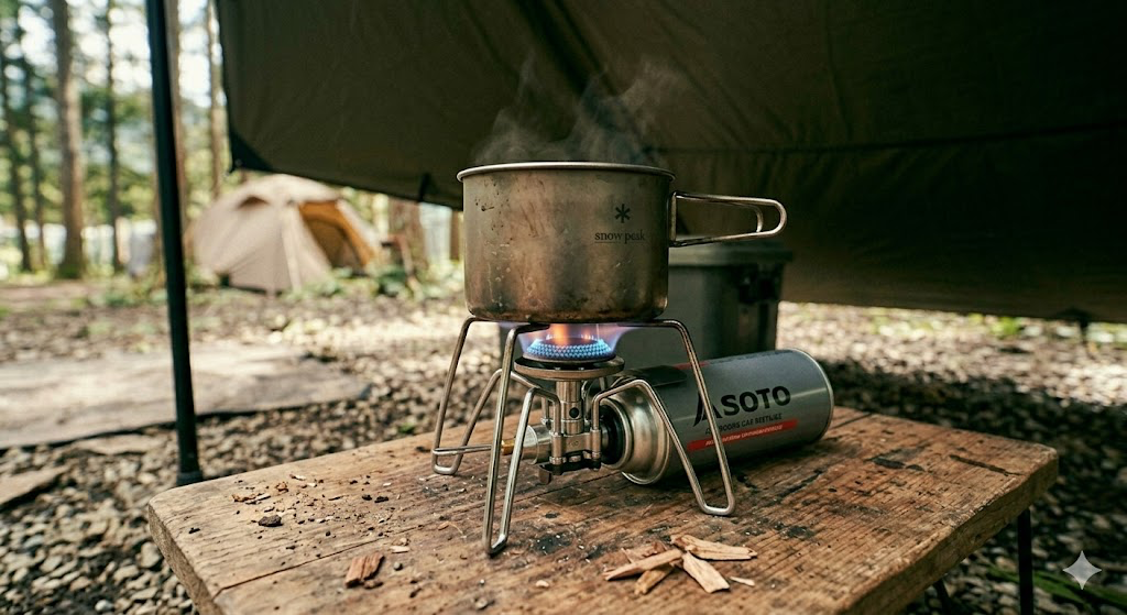 焚き火で料理するのも風情がありますが、サッとコーヒーを飲みたい時や、安定した火力で料理したい時はバーナーが圧倒的に便利です。