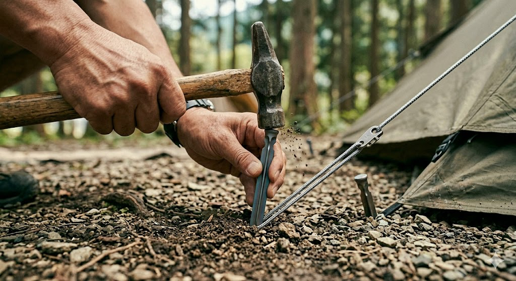 特にペグは、テントに付属しているものだけでは硬い地面に対応できないことが多いです。